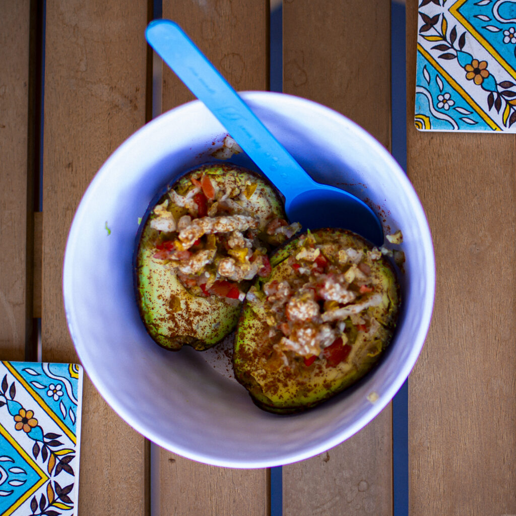 2 Whole Ripe Avocado Halves filled with * Zroo drizzled with a Lemon/Lime Tahini, Salt, Pepper, Spices and a dash of Cayenne.