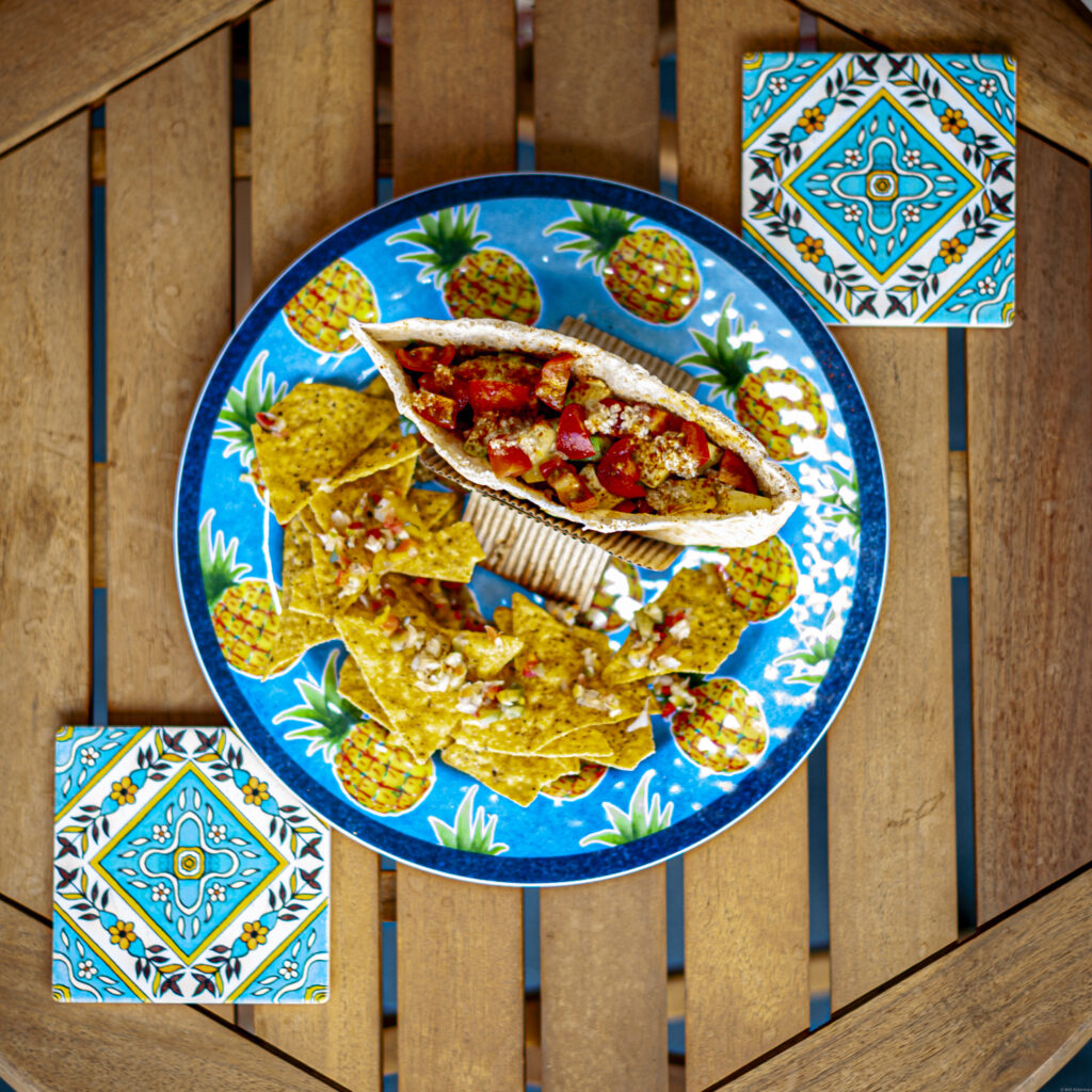 Bed Of Spring Mixed Greens chopped with Hummus (Plain , Garlic, Roasted Red Pepper), *Zroo (Fresh minced Carrot, Onion, Garlic, Pepper, Tomato, Cucumber, Celery Seed, Cayenne, Spices), Avocado and Tahini drizzled on top. Served on pita w/side of Chips & *Zroo.