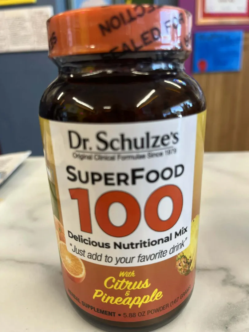 Superfood drink mix with citrus + pineapple. An easy add-in for a daily routine at home. Available for pickup with your smoothie order.
